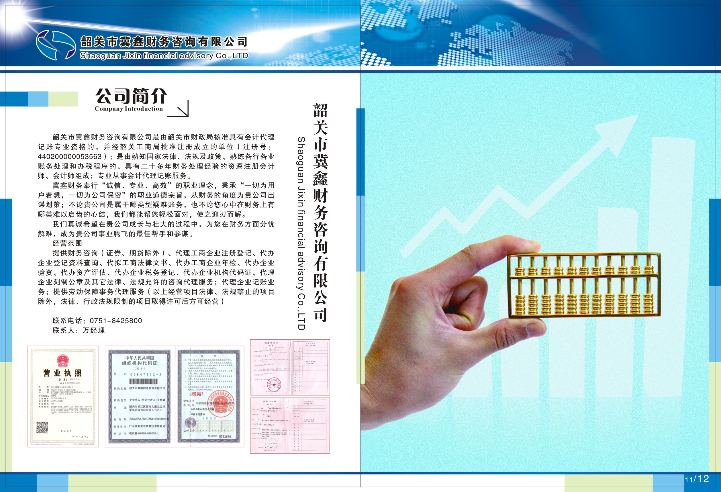 韶關(guān)市冀鑫財(cái)務(wù)咨詢有限公司是有韶關(guān)市財(cái)務(wù)局核準(zhǔn)具有會(huì)計(jì)代理記賬專業(yè)資格的,并經(jīng)韶關(guān)工商局批準(zhǔn)注冊(cè)成立的單位(注冊(cè)號(hào):440200000053563);是由熟知國(guó)家法律、法規(guī)及政策、熟練各行各業(yè)賬務(wù)處理和辦稅程序的、具有二十多年財(cái)務(wù)處理經(jīng)驗(yàn)的資深注冊(cè)會(huì)計(jì)師、會(huì)計(jì)師組成;專業(yè)從事會(huì)計(jì)代理記賬服務(wù)。