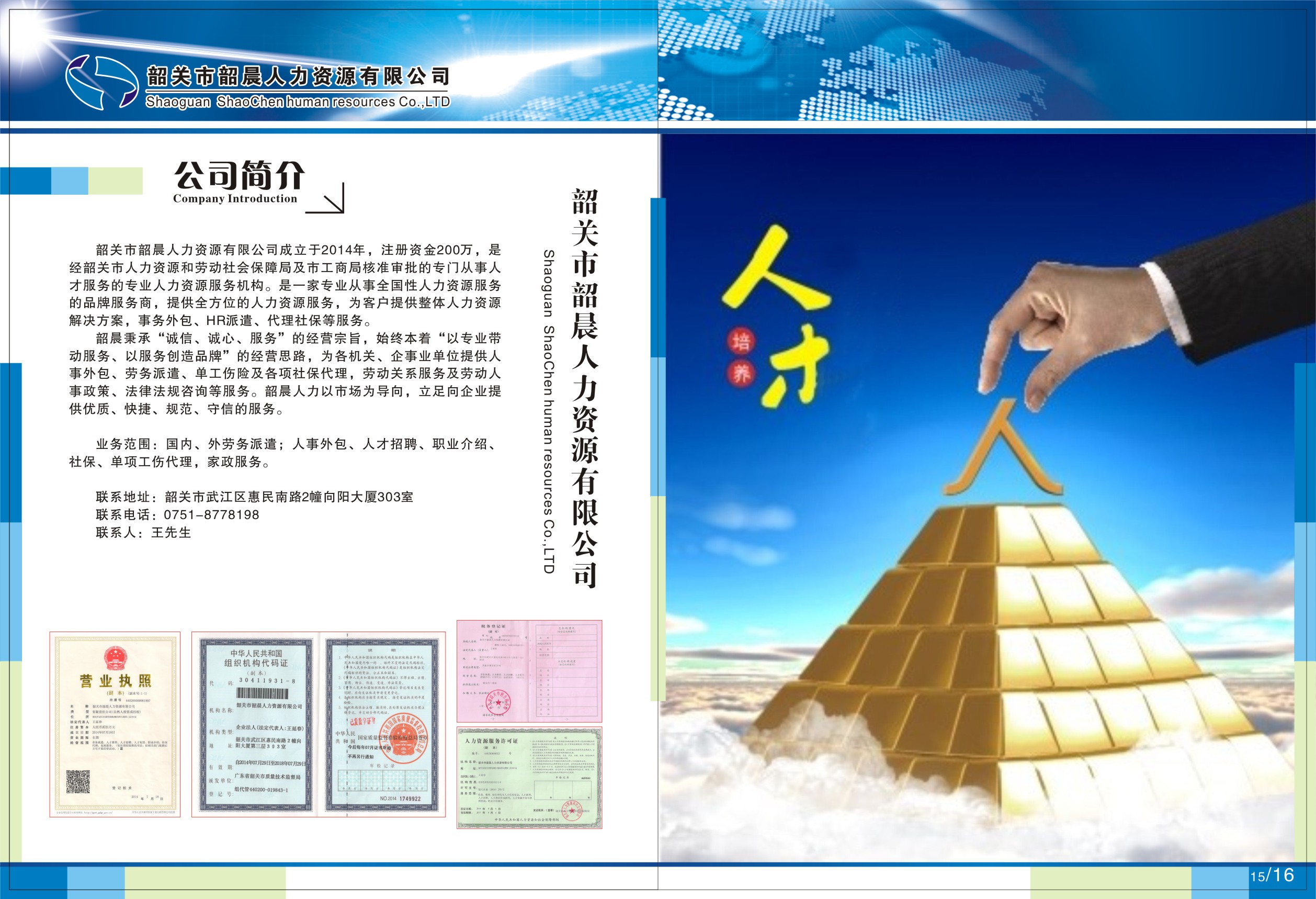 韶關市韶晨人力資源有限公司成立于2014年,注冊資金200萬,是經韶關市人力資源和勞動社會保障局及市工商局核準審批的專門從事人才服務的專業人力資源服務機構。是一家專業從事全國性人力資源服務的品牌服務商,提供全方位的人力資源服務,為客戶提供整體人力資源解決方案,事務外包、HR派遣、代理社保等服務。